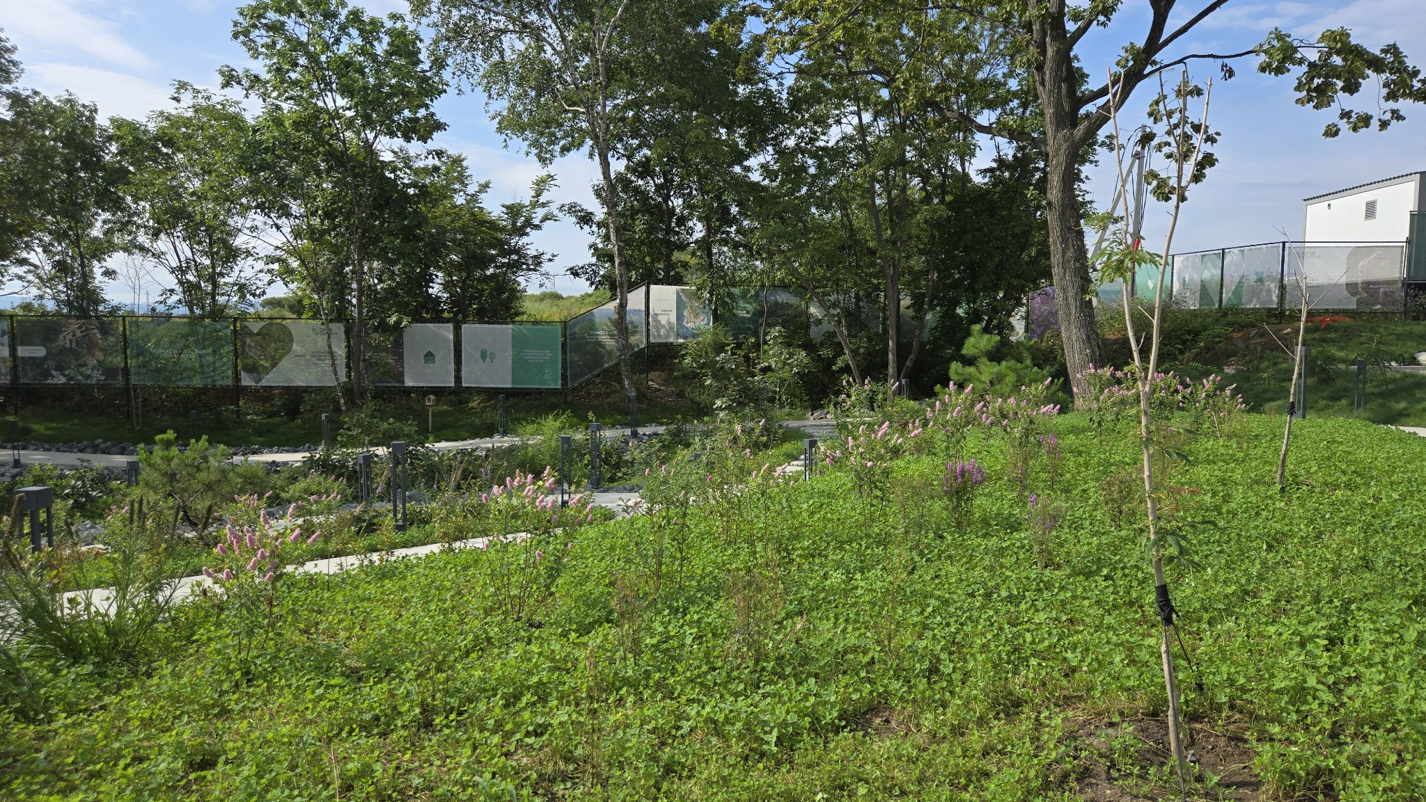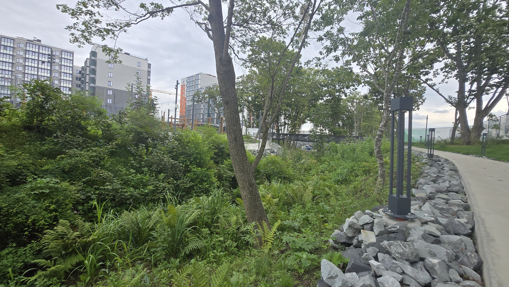 Концепция озеленения микрорайона ДНС Сити основана на удивительной схожести территории с географической картой Приморского края. Эта метафора лежит в основе всего проекта, а Первый жилой дом, расположенный в южной части комплекса, становится своеобразным местом, которое отражает природное богатство южной части Приморья.